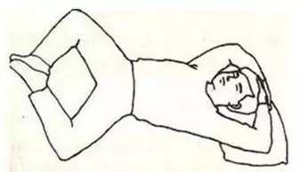 身体自然平躺,髋关节放松,腿似环,两脚心相对,脚后跟最好直对着会阴(如果能顶着会阴最好)两手心放于大腿根部附近,掌心向着腹部。仰卧由于着床面积大,压迫力较小,身体更容易放松。