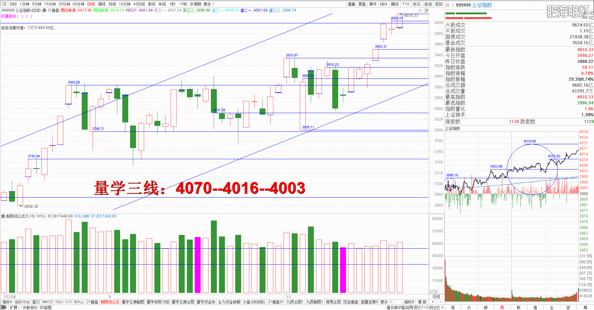 一、 昨日研判:收盘没有跌破昨日阳半,结合今日量价建构解读三先规律量柱语言,有缩量不足滞涨表现,但是如果明日竞价高开且量波正三维站稳昨日高量阳实顶就是变态,我们即可按照量学变态知识点顺势而为。量学【上日三线】:3996--3988--3982.早盘竞价高开强势信号,只要量波正三维有效站稳3996点阳实顶上方,即可继续模拟训练量学替领尽量知识点,开盘后早盘稍有震荡,有效站稳3996点上方后震荡上行,最终收盘小中阳,对应量柱微增量,明日结合开盘定势,强势应该继续竞价高开,一旦量波正三维将继续上攻通道线上轨,明日周四,一旦强势上攻触及通道线上轨不过,周五继续不过上轨,就要随时预防再次出现回落,因为本波段已经连续拉升7连阳,已经进入量学极阳,一旦出现次阴,就需随时做好调整防控的准备,稳健者明日做好量学“四进五出”知识点准备。明日量学【上日三线】:4070--4016--4003.