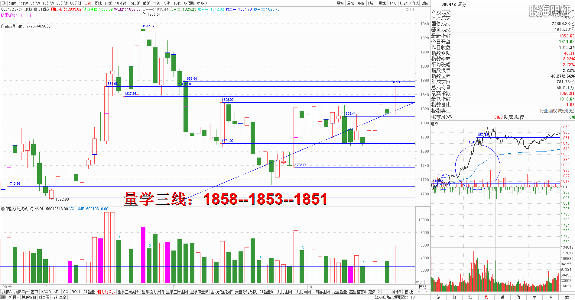 三、板块解析:行业板块【电气设备11板第一;化工6板第二;软件服务,房地产,建筑,有色各4板第三】;概念板块【储能18板第一;光伏15板第二;新能源车,一带一路锂电池各133板第三;人工智能12板第四;DeepSeek,机器人,风电各9板失误】;今日新能源热点,新科技与新基建(内需类)辅助;主线方向新科技与新能源继续模拟跟踪板块轮动,主线方向整体量性转强,明日继续模拟学习量波正三维健康结合量学零号战法。风向标证券,早盘竞价跳空明显示弱, 开盘小幅震荡后站稳人线开始震荡拉升,收盘中阳对应量柱倍量柱,完美验证昨日预判二龙定位处叉上中大阳,明日强势应该竞价高开,量波正三维有效站稳最近大阴实顶1858点上方将继续引领大盘上攻,反之不能高开,回踩只要继续有效站稳1837点黄金谷底线上方不破且对应大幅缩量则不会出现大的系统性问题,只需静候以今日次阳作为基柱王牌柱量性转强即可。