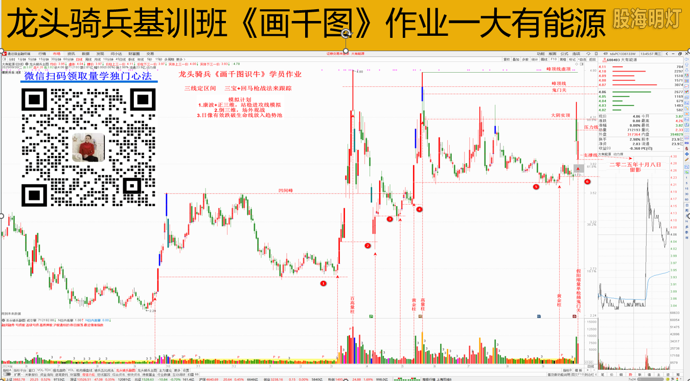 大有能源是基训班国庆画线作业,该股当天收假阳单枪,常态示跌变态示涨,第二天走常态,缩量下跌收阴线,10月10日出现阴线变态,康波正三维上车,其后出十天九板,上车的学员们在群里惊呼,量学牛,量学在神奇了,感恩量学!感恩王子老师!感谢教练!过往案例仅作技术分析,若有实盘后果自负!股市有风险,投资需谨慎!