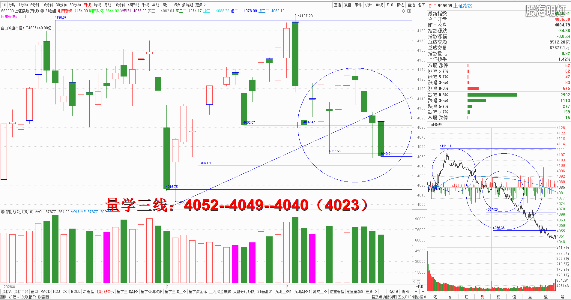 友情提示:股市有风险,入市需谨慎!本文是纯专业量学知识点分享,所有术语均出自量学五本专业教材,本文分析仅代表作者个人观点,我们采用清华大学出版社、经济日报出版社和四川人民出版社《量学经典教材》,旨在记录和验证量学盘前预报,总结提升量学经验,积累历史档案,不为操盘指导,据此实盘者盈亏自负,均与作者无关!好的谷票管一阵子,好的技术管一辈子,学习改变人生,学习改变未来!我们不但教给大家量学技术,更为大家提供适合自己的量学方案,让我们快来一起学习吧! 一、 昨日研判:左侧王牌柱已经全部牺牲,明日必须出现有效次阳且后三日重新构建量学刹车王牌柱且量性转强后才能继续上行,反之一旦明日有效跌破4082点黄金谷底线,还需预防更深福下行;盘面当前建构再次处于量学二龙定位范围之内,叉上叉下两重天,所以明日是重要的变盘窗口,明日结合开盘定势,强势应该竞价高开且量波正三维有效回补4095点跳空缺口则有望中大阳反弹,反之一旦有效下叉且跌破4082点黄金谷底线需预防中大阴向下“摸腿”,任何时候我们必须严格执行量学标准模拟训练学习,在解读量学三先规律量柱语言之后,根据主力动作模拟训练顺势而为。量学【上日三线】:4095--4084--4082.早盘小幅高开,开盘量波天线围绕人线上下震荡,形成分时平底后后反弹,但是拉升过程明显量价不跟属于量学虚攻,结合量波测幅圆技术,当天线未能站上圆顶且量波峰顶线下降时,就是最佳的模拟训练逢高替领的机会,其后受风向标券券一律震荡下跌的影响,大盘跟随跳水下行,盘中有效跌的破4082点黄金谷底线的时候,就是必须严格执行防控或退出的标准,这时就是量学九阴真经——底线穿,出来观。最终收盘光脚中阴单枪,对应量柱微缩量,今日建构属于量学长阴短柱,明日常态还应继续惯性下行,结合开盘定势,一旦竞价低开且有效跌破最近金线4040点,将继续向下加速下探本波测幅圆底4023点。本波段生命线为左侧大阴实底谷底线4015点,一旦此线继续击穿,就要小心更深福下探可能,因为周线级别目前已经跌破4065点谷底线,本周只要不能有效收回4065点上方,周线级别下跌目标位就是3968点附近,不得不防,那么凡是今天严格执行量学标准者,后势继续模拟学习量学不见有效次阳不动心知识点。明日量学【上日三线】:4052--4049--4040(4023)。
