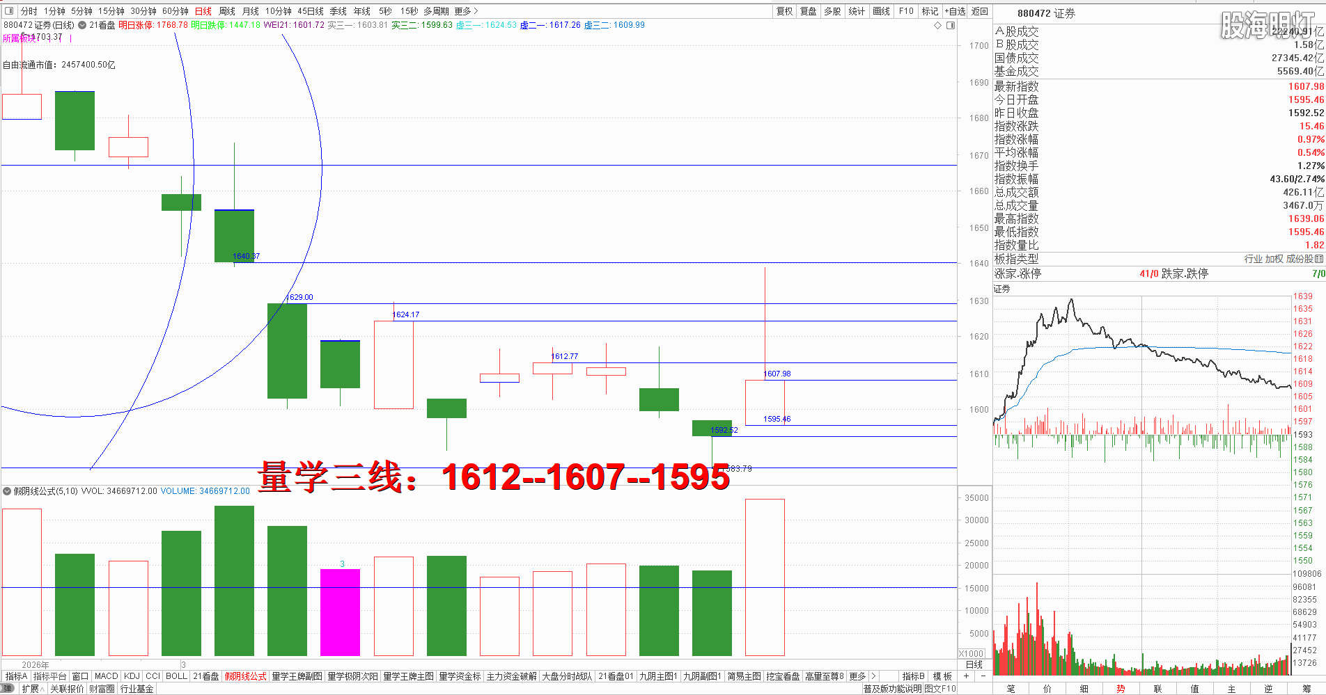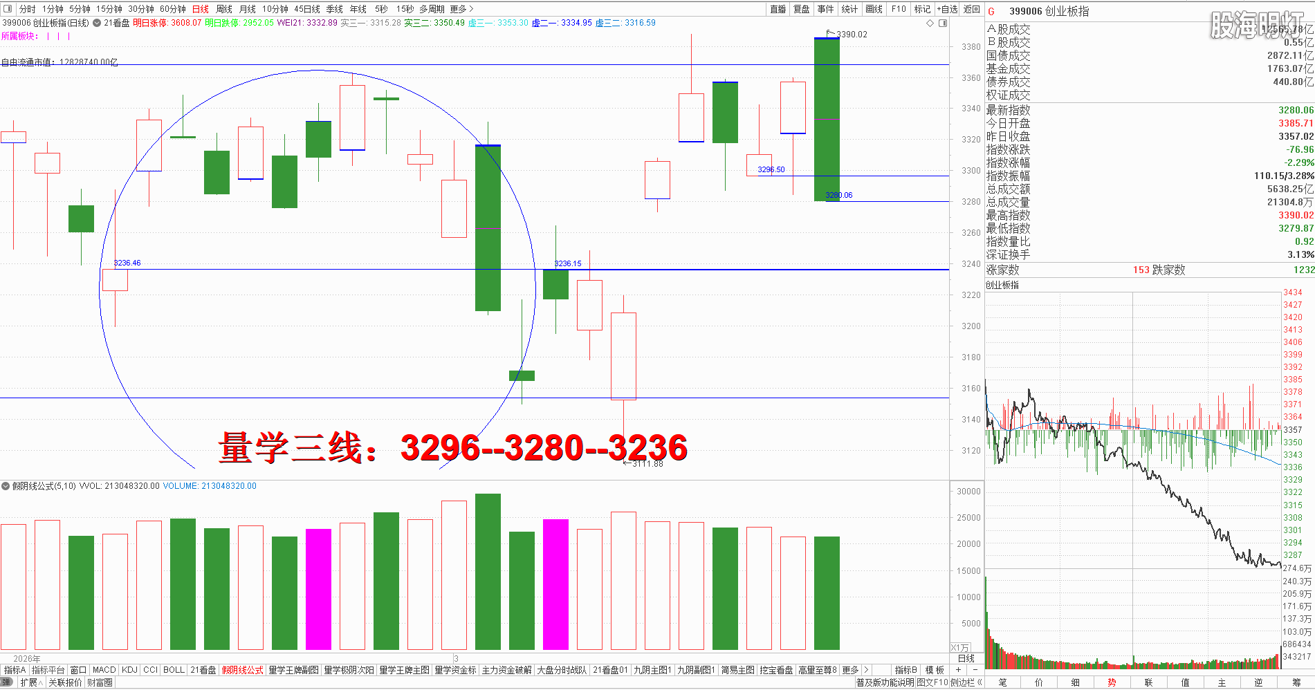 二、创业板研判:今天常态看涨,变态防跌。早盘竞价高开后不能有效站上最近左峰,其后受大盘影响一路跳水下行,收盘大阴吃掉近两日涨幅并跌破最近金线,对应量柱平量昨日阳柱,今日出现量学多重九阴真经信号,明日常态看跌。量学三段以上高手可继续模拟训练“不理指数,精练个谷”;涨停趋势依然是量学“极阴次阳回马枪战法+凹里淘金战法”为主,今日收盘5只20CM,模拟训练难度非常考验量学功底;后势涨停趋势可继续模拟学习量学凹底淘金知识点+极阴次阳回马枪+康桥战法模拟训练,要特别训练出现首跌缩量,精准回踩重要量线出现有效次阳后出现量学刹车王牌柱知识点后,看不懂量学建构,不明白量学量波技术原理,切忌盘中盲目追涨杀跌,看不懂就不要强求。模拟训练一定要训练在自己认知之内的案例,看不懂的案例还需做到:宁错过,不做错。一般人最好耐心模拟学习量学不见次阳不动心知识点。 明日量学【创业板三线】:3296--3280--3236。 三、板块解析:行业板块【电气设备,化工各6板第一;房地产,建筑,电力各4板第二;元器件,汽车类各3板第三】;概念板块【储能15板第一;光伏13板第二;风电9板第三】; 今天新能源类热点,新内需与新能源类辅助;后势继续跟踪主线板块新科技与新能源类轮动,主线类板块今日集体破位,后势还有继续下探的需求,稳健者静候回踩到位出现有效次阳后再择机模拟学习; 有色板块明日将考验最近生命线1871点支撑,此线不破后势有望反弹,一旦继续跌破还将继续下行;黄金概念同理。 风向标证券,收盘倍量小阳长枪,结合三先规律量柱语言,今天明显是遭遇了大量抛压的表现,后势还有继续消化抛压的需求,明日不可有效跌破今日小阳实底,一旦有效跌破必然拖累大盘向下加速,只有券券次阳后能够构建量学刹车王牌柱且量性转强,才能有效引领大盘开启反弹。 四、涨停趋势:跳空阳战法+极阴次阳战法+凹里淘金战法+回马枪战法+三低三有战法,学习可参照量学五大天经教材《伏击涨停》,《涨停密码》相关章节内容学习。