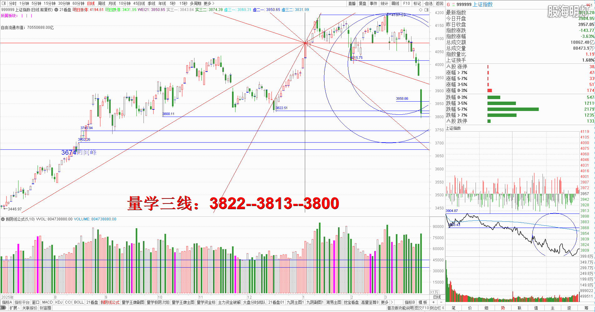 一、 昨日研判:将继续下探第二测幅圆底3910点,今日建构依然属于量学长阴短柱,对应量柱平量阴,周一常态还应继续惯性下探,同时结合今日量价建构有主力开始向下加速探底的意图,稳健者这时就需继续耐心静候有效次阳出现,严格执行量学不见有效次阳不动心知识点。周一量学【上日三线】:3965--3957--3947(3936)。早盘大幅跳空阴低开,开盘后立刻跳水,虽有反弹但量价不跟,跌破人线后在风向标券券一路下行带动下跟随震荡下跌,收盘跌幅144点大阴,对应量柱明显放量,明日将考验3800点黄金谷底线支撑,明日3800点将是重要变盘窗口,站稳此线有望出现反弹,继续击穿此线就将继续加速下行至下一目标位3700附近,那么明日出现次阳必须有效站稳今日阴半实体二一位3858点上方,才是符合量学标准的有效次阳,凡是不能站上3858点上方的阳均为量学假阳真阴,那么假阳必须得到次日有效真阳确认,没有确认之前只有前期深幅被套者结合量学替领模拟训练降低成本的机会,没有稳健者模拟训练的标准,同时今日明天放量说明已经开始把部分恐慌盘挤压出来了,但是结合三先规律量柱语言今天依然有放量不足的表现,那么后势能否反弹必须继续耐心等候次阳过阴半,同时如果想要有力的反弹必须出现一个“飘龙波”的大阳来盖阴,否则即便出现反弹还会继续震荡磨底,同时,后势不能有效站上今日大阴实顶之前,只能先看做短线反弹行情,只有站上今日阴顶不破再向上才能开启波段反弹的节奏。当下的模拟训练核心依然是:不见量学有效次阳不动心。明日量学【上日三线】:3822--3813--3800.