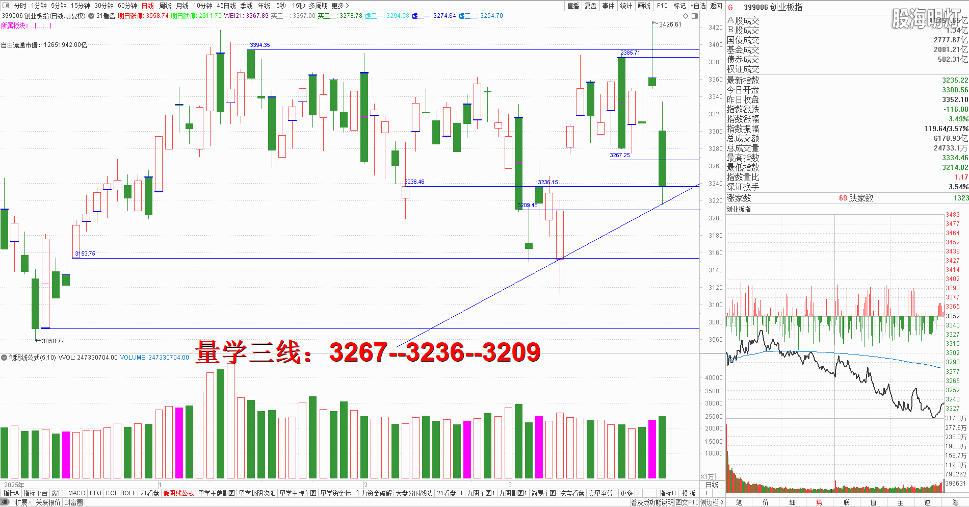 二、创业板研判:今天早盘跟随大盘低开,收盘中阴,对应量柱阴梯量第三柱,有明显的主力越跌越吸的表现,量价建构属于量学长阴短柱,明日常态看跌,变态防反弹。量学三段以上高手可继续模拟训练“不理指数,精练个谷”;涨停趋势依然是量学“极阴次阳回马枪战法+凹里淘金战法”为主,今日收盘3只20CM,模拟训练难度非常考验量学功底;后势涨停趋势可继续模拟学习量学凹底淘金知识点+极阴次阳回马枪+康桥战法模拟训练,要特别训练出现首跌缩量,精准回踩重要量线出现有效次阳后出现量学刹车王牌柱知识点后,看不懂量学建构,不明白量学量波技术原理,切忌盘中盲目追涨杀跌,看不懂就不要强求。模拟训练一定要训练在自己认知之内的案例,看不懂的案例还需做到:宁错过,不做错。一般人最好耐心模拟学习量学不见次阳不动心知识点。 周一量学【创业板三线】:3267--3235--3209。