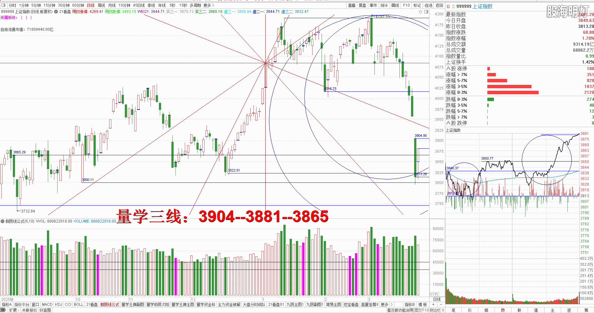 如果想要有力的反弹必须出现一个“飘龙波”的大阳来盖阴,否则即便出现反弹还会继续震荡磨底,同时,后势不能有效站上今日大阴实顶之前,只能先看做短线反弹行情,只有站上今日阴顶不破再向上才能开启波段反弹的节奏。当下的模拟训练核心依然是:不见量学有效次阳不动心。量学【上日三线】:3822--3813--3800.早盘在一片盼涨声中大盘高开36点,可惜的是开盘立刻跳水,其后盘中深幅挖坑,最低点刺穿昨日大阴实底后,受风向标券券恐龙波急拉的影响,瞬间快速拉起反弹,其后震荡上攻,形成分时平顶后盘中跟随券券急跌挖坑,一点半再次返回人线上方,2点后继续拉升,收盘中阳长腿,对应量柱微缩量,结合今日盘中量波表现,只适合前期被套者结合量波模拟训练替领快速降低自己的模拟持有成本,盘中看不懂的案例急拉并不适合盲目模拟新案例,今天虽然次阳但是整体量性不强,明日还应继续真阳站上昨日高量阴实顶不破,结合开盘定势明日应该继续竞价高开且量波正三维有效站稳3904点阴顶不破,反之不能达标就还需谨防出现回踩,因为风向标券券今天仅仅出现一个缩量假阳真阴长腿十字星,一旦券券明日不能真阳确认,必然继续拖累大盘反弹节奏,而且今天是下降途中第一个次阳,这种次阳往往还是试探的意图大于上攻的意图,所以稳健者最好耐心等待量学刹车王牌柱出现且量性转强,3094点大阴实顶没有站稳之前还不能盲目急于X底,同时明日即便上攻一旦出现滞涨表现,最好结合被套案例的替领自救及时模拟训练高抛替领,三段以上高手模拟训练925的也好做好严控仓位前提下的快进快出策略。明日量学【上日三线】:3904--3881--3865.
