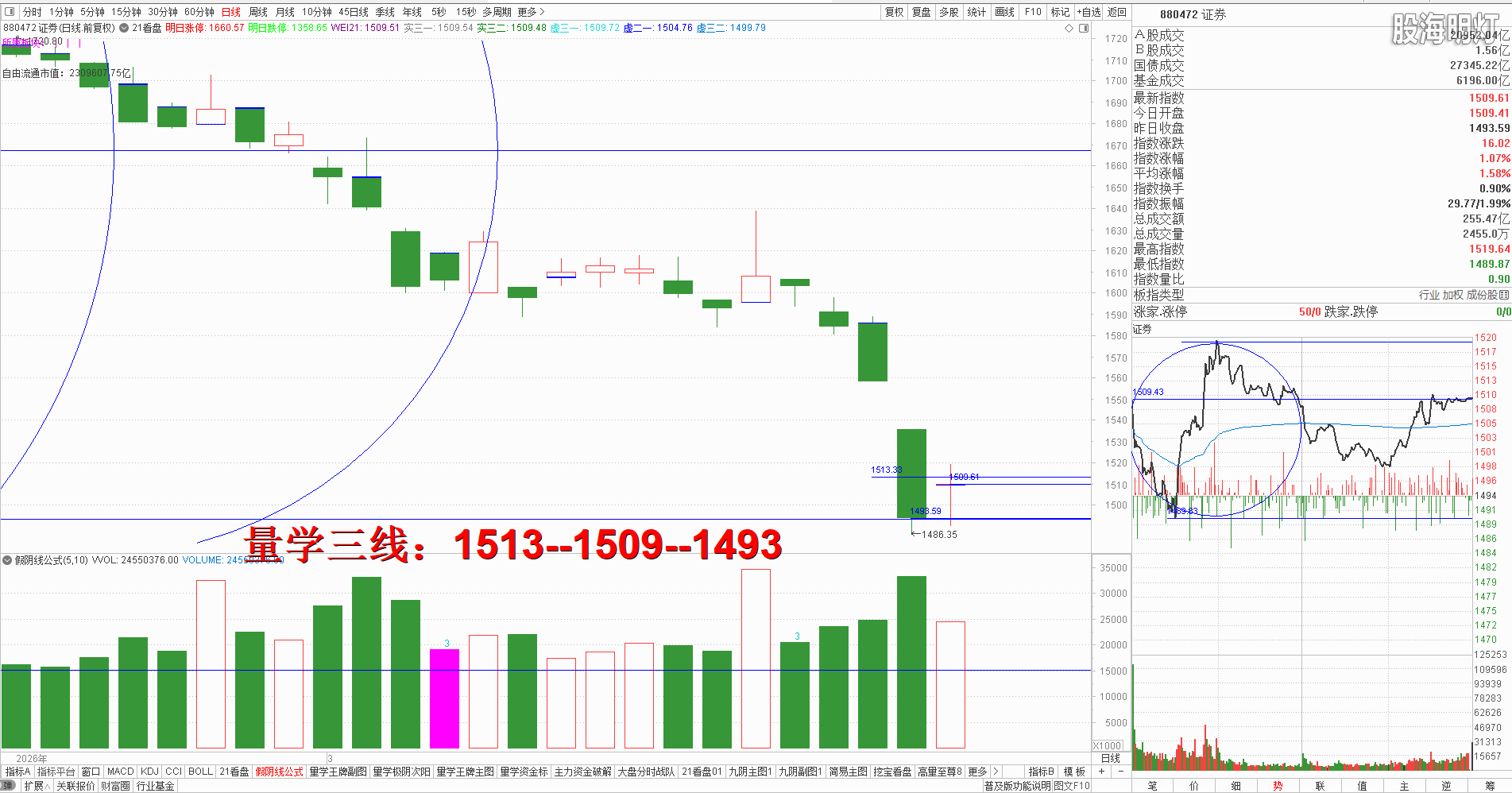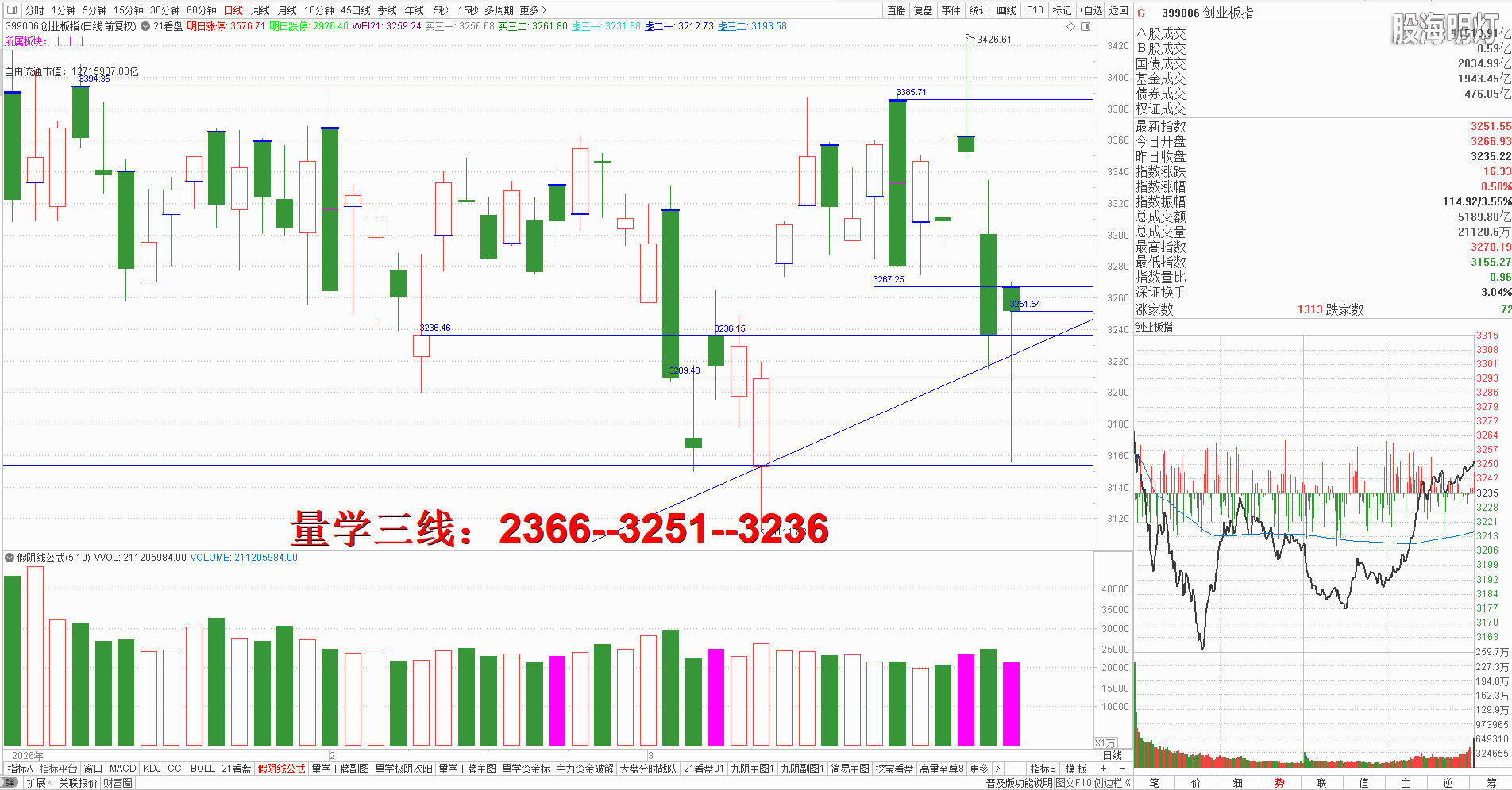 二、创业板研判:今天早盘高开低走盘中跟随大盘剧烈震荡,收盘长腿小阴没有跌破昨日大阴实底,对应量柱明显缩量,明日仍需继续静候有效次阳出现。量学三段以上高手可继续模拟训练“不理指数,精练个谷”;涨停趋势依然是量学“极阴次阳回马枪战法+凹里淘金战法”为主,今日收盘4只20CM,模拟训练难度非常考验量学功底;后势涨停趋势可继续模拟学习量学凹底淘金知识点+极阴次阳回马枪+康桥战法模拟训练,要特别训练出现首跌缩量,精准回踩重要量线出现有效次阳后出现量学刹车王牌柱知识点后,看不懂量学建构,不明白量学量波技术原理,切忌盘中盲目追涨杀跌,看不懂就不要强求。模拟训练一定要训练在自己认知之内的案例,看不懂的案例还需做到:宁错过,不做错。一般人最好耐心模拟学习量学不见次阳不动心知识点。 明日量学【创业板三线】:3267--3251--3236。