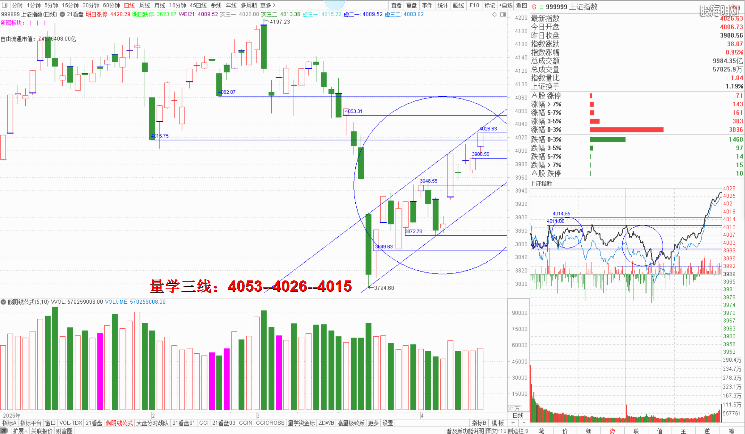 一、 昨日研判:结合开盘定势,强势确认应该竞价高开且量波正三维有效站稳3995点高量阳实顶康桥不破;弱势低开也应量波正三维有效站稳今日假阳实顶且继续站上3995点上方才强,不能达标就需预防再次回踩今日家阳实底,假阳实底不破仍可模拟训练量学盘中替领,一旦今日假阳实底有效跌破就需预防中阴下探出现,一旦有效跌破最近金线3966点,就需及时模拟训练防控,然后静候再次回踩到位出现次阳。量学【上日三线】:3995--3988--3966。早盘竞价高开于预定上线3995点上方,属于强势信号,那么就需量波正三维健康有效站上4015点黄金谷底线上方才安全,开盘量波明显不健康,同时结合黄白双线知识点,今天黄线在下,量学箴言:上白线,银子埋。就是说今天代表中小案例的黄线今天处于调整打压,而权重类今天活跃,那么模拟训练中小案例者就需结合持有模拟案例的位置,建构与最近支撑与压力位模拟训练量学替领知识点为主,在没有站上4015点黄金谷底线之前不易盲目盘中胡乱追高,中午收盘前量波形成三平顶后,下午开盘快速下跌并在盘中深幅挖坑,其后在风向标券券反弹带动下快速拉升,收盘带有下影线的小中阳,对应量柱微增量,明日结合开盘定势,强势应该继续竞价高开,一旦量波正三维健康继续继续模拟训练量学替领精炼知识点;反之不能高开就属于示弱信号,回踩必须有效站稳4015谷底线不破且明显缩量方可继续模拟训练替领精炼知识点,明日量学【上日三线】:4053--4026--4015