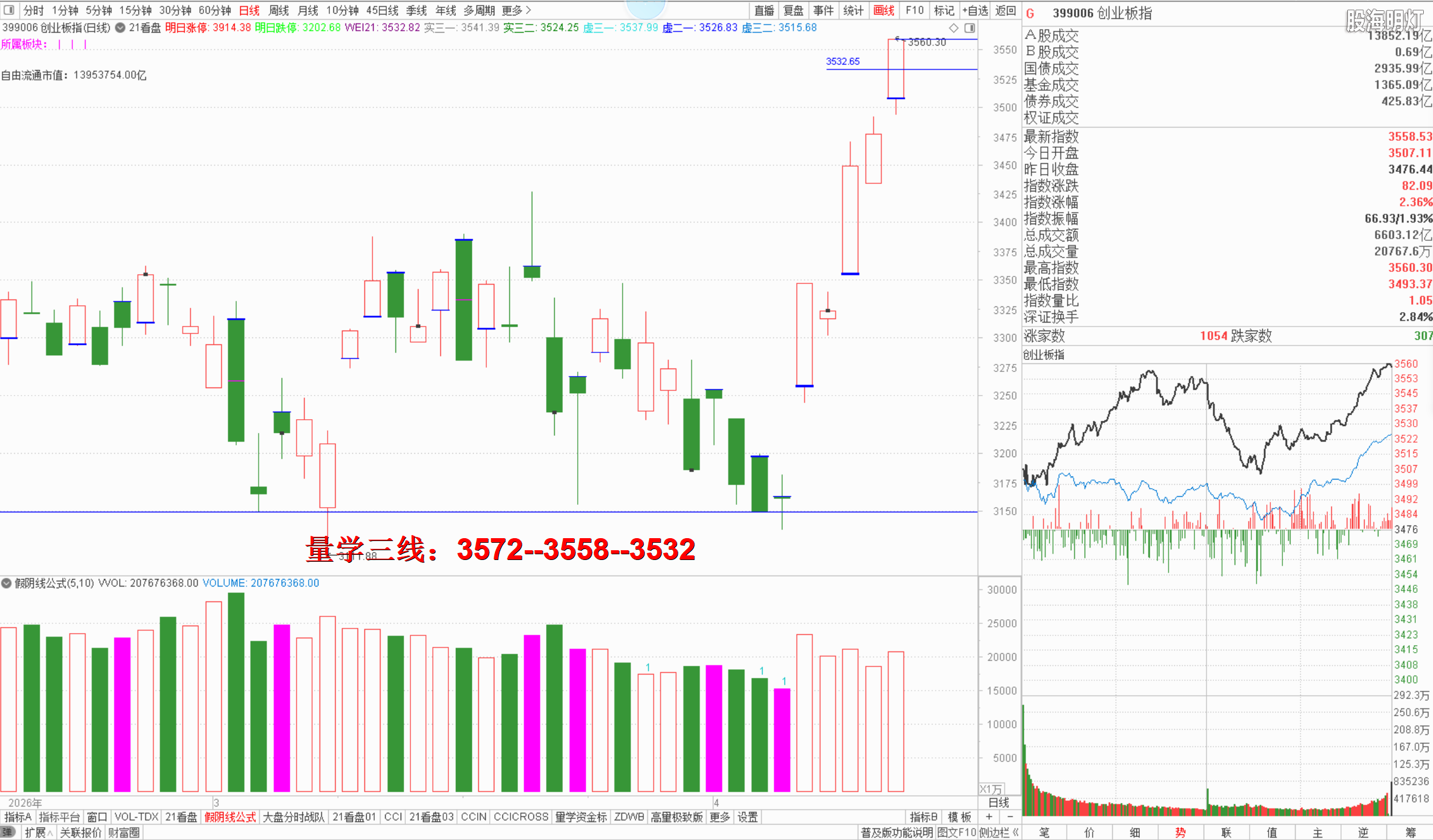 二、创业板研判:今天竞价高开,开盘震旦上攻,早盘形成峰顶下降后手大盘影响深幅挖坑,下午跟随大盘反弹拉升,收盘中阳对应量柱温和增量,明日常态还应继续惯性上冲,明日能否有效站稳最近左锋上方是关键,一旦不能有效站上左峰就需预防峰顶受阻后出现深幅回落。量学三段以上高手可继续模拟训练“不理指数,精练个谷”;涨停趋势依然是量学“极阴次阳回马枪战法+凹里淘金战法”为主,今日收盘5只20CM,可见今日人品低迷且模拟训练难度明显增大,模拟训练难度非常考验量学功底;后势涨停趋势可继续模拟学习量学凹底淘金知识点+极阴次阳回马枪+康桥战法模拟训练,要特别训练出现首跌缩量,精准回踩重要量线出现有效次阳后出现量学刹车王牌柱知识点后,看不懂量学建构,不明白量学量波技术原理,切忌盘中盲目追涨杀跌,看不懂就不要强求。模拟训练一定要训练在自己认知之内的案例,看不懂的案例还需做到:宁错过,不做错。一般人最好耐心模拟学习量学不见次阳不动心知识点。 明日量学【创业板三线】:3572--3558--3532。
