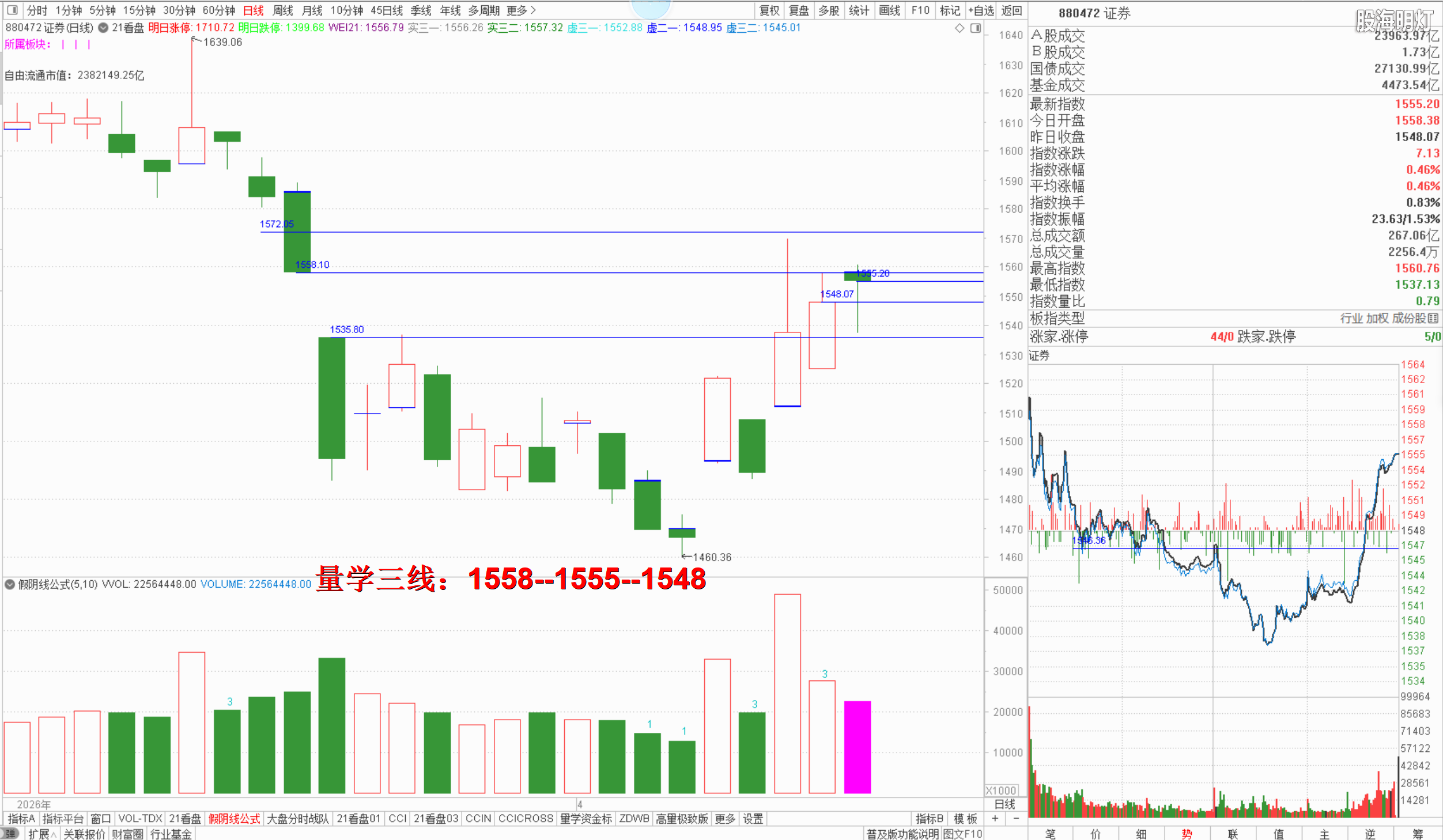 风向标证券,今天竞价高开,但是开盘即震荡下跌,严重拖累大盘上攻节奏,并拖累大盘盘中深幅挖坑,下午开盘后回踩左侧大阴康桥1535点得到支撑开启快速急拉反弹,并引领大盘强势反弹拉升,券券收盘长腿假阴真阳,对应量柱微缩量,明日能否千牛待涨还需有效真阳盖假阴实顶并站稳,达标则大势无忧,反之一旦券券不能确认今日假阴而向下回踩,必然拖累大盘继续震荡。