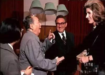 图:毛主席对基辛格夫人比基辛格高感到惊奇。