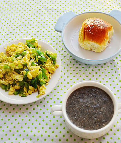 、肉松面包 山药黑豆核桃杏仁芝麻糊 青椒炒蛋