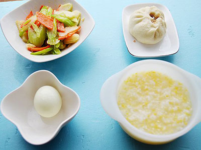 、猪肉白菜豆腐粉条包 玉米小米粥 胡萝卜西芹炒马蹄 白煮蛋