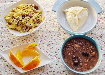 、面包 木耳炒鸡蛋 赤豆粥 煮马蹄。