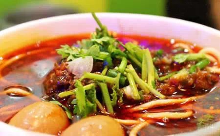 4、碗中放入麻油少许、葱花、牛肉汤,加入面条、青菜、牛肉即可。