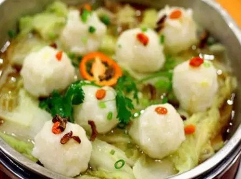 5、将虾球、肉馅球、西红柿块、姜片一起放入沸水中煮熟,再加少量盐调味。