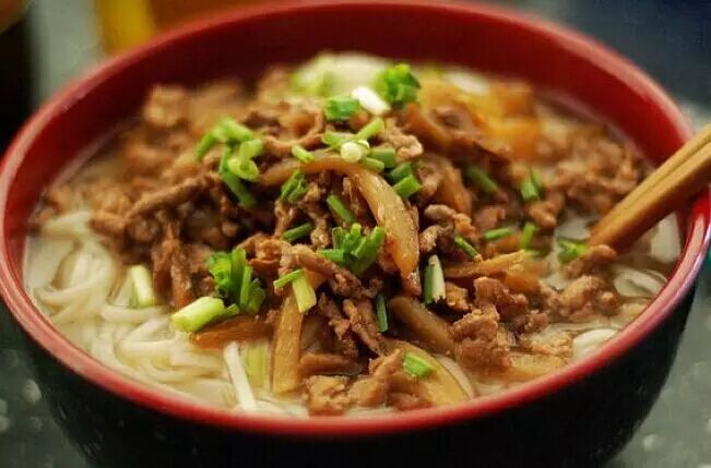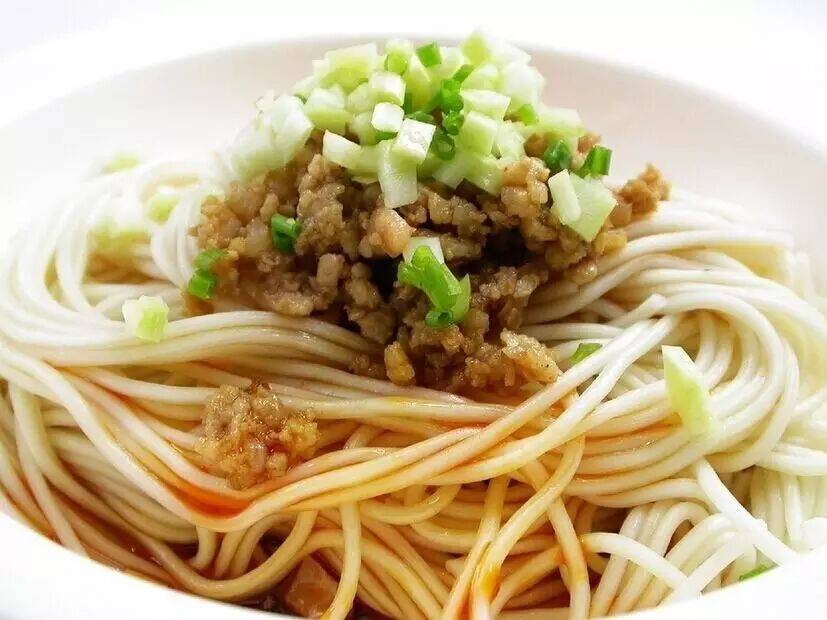 4、将调味料放面碗内,盛入面条,铺少许炒好的榨菜肉丝并撒葱花少许即成。