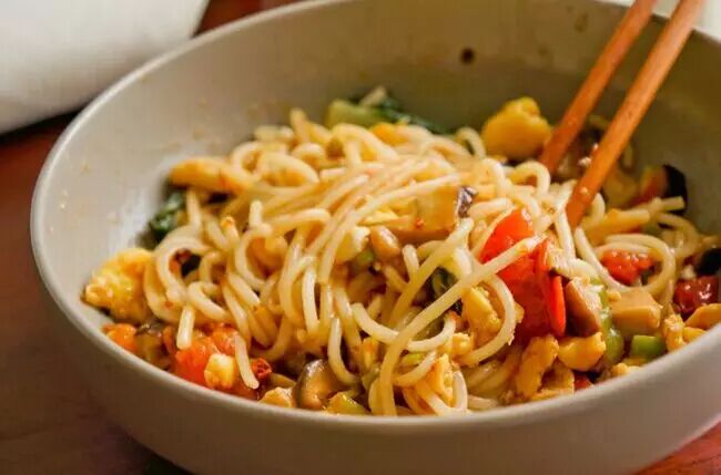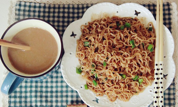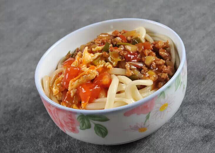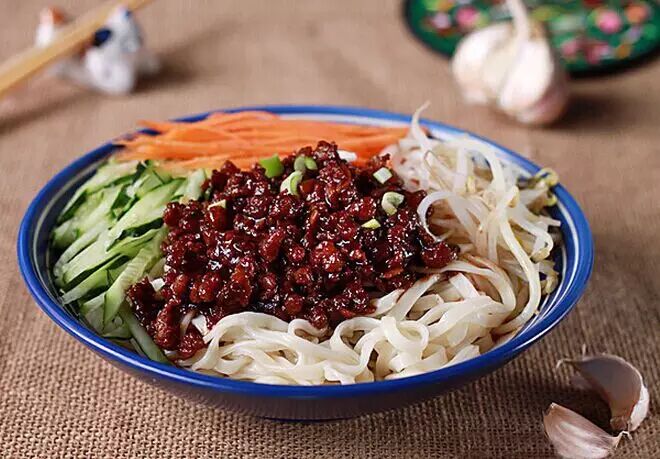 7、将煮好的面条沥干水分,放放入碗内,然后浇上炒好的杂酱。搅拌均匀即可食用。