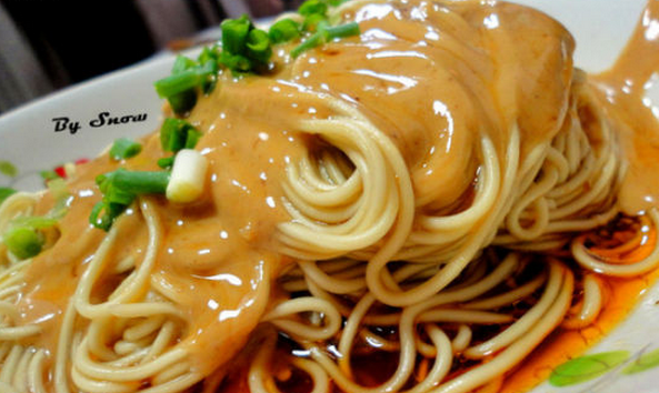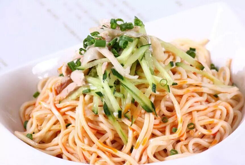做法:面条煮熟,过凉开水备用。锅里热油,加葱碎,小火炸至葱变黄,发糊之前捞出不要。葱油倒入面条里,加黄瓜丝,生抽,醋,盐,香油,芝麻拌匀即可。