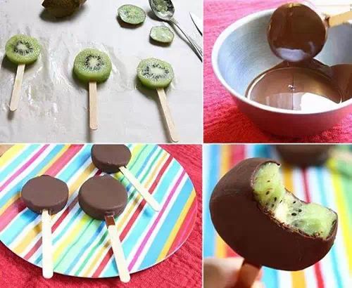 10 将猕猴桃切成片,然后裹上巧克力酱,入冰柜冷冻,尽情享受美味吧。