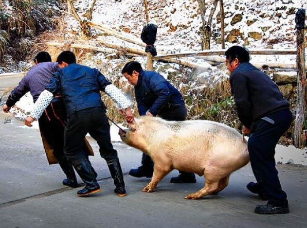 女主人出院后亲戚都来看望,男主人把肥猪宰了招待客人。