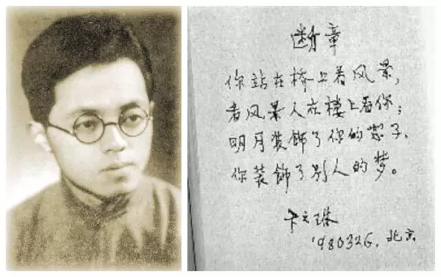 可是,多年后,和朋友兼学生苏炜谈到这段“苦恋”,张充和说:“这完全是一个无中生有的故事,说苦恋都有点勉强。我完全没有和他恋过,所以谈不上苦与不苦。”他精心写给她的那些信,可能有上百封,她看过就丢了,从来没有回过。她以为这样的态度已经很明确了,可他还是坚持不懈地给她写信。当苏炜问到,你为什么不跟他说清楚呢。充和回答说:“他从来没有说请客,我怎么能说不来。” 卞之琳与诗作 在充和的印象里,卞之琳人很不开朗,甚至是很孤僻的,性格又收敛,又敏感,属于“不能惹,一惹就不得了”的类型。所以她总是不敢“惹”她,从来不敢单独和他出去,连看戏都没有。之所以传出苦恋的传言,可能是因为当事人表白和拒绝的方式都太委婉。