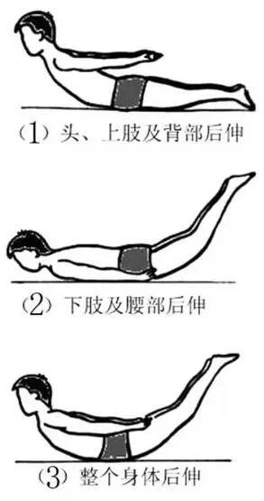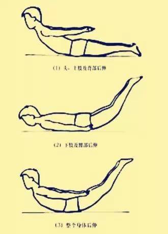 2、俯卧式小燕飞 在硬床上,取俯卧位,脸部朝下,双臂以肩关节为支撑点,轻轻抬起,手臂向上的同时轻轻抬头,双肩向后向上收起(肩胛骨收缩)。与此同时,双脚轻轻抬起,腰底部肌肉收缩,尽量让肋骨和腹部支撑身体,持续3~5秒,然后放松肌肉,四肢和头部回归原位休息3~5秒再做。每天可做30~50下。刚开始时,可先做10~20下,逐渐增加。