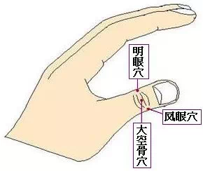 在我们的拇指上有三个相邻接的穴道,分别是明眼、凤眼、大空骨(如上图)。 明眼、凤眼能够改善眼睛疲劳和急性结膜炎,大空骨则可改善一切有关眼睛的症状。平时眼睛容易疲劳的人,每天要刺激这三个穴道两次。
