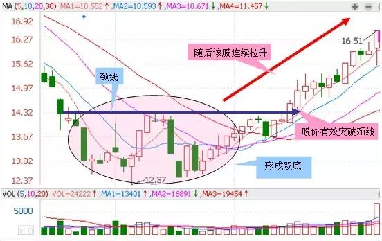 此K线形态也是一根大阳线,但是这根大阳线上穿三条均线,使均线呈现多头排列形态,后势极端看涨。三条均线指5日10日20日,这是一个中期或波段式的上涨行情,缩量回调是买进时机。1、K线实体要大,尾盘分时不能有急跌;2、长阳上穿3条均线;3、若有过倍巨量则长阳后有回调。 9、“双底”。