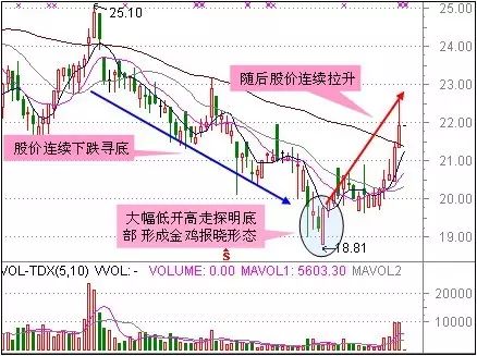 前期放量上涨之后出现破坏均线的震仓动作,成交量连续萎缩,与前期量比呈芝麻点,后温和放量发力穿越5、10、20曰均线摆脱池底,随后回落20曰均线,此时为最佳的低吸点,后市有望发动中级反弹行情。 15、“金鸡报晓”。