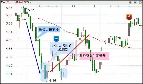 此K线形态是指在股价持续滑落过程中,某一日大幅向下跳空开盘,但得不到多空双方的共同认可,股价被快速拉升回前一日收盘价附近。这是主通过大幅低开以探明底部引领股反弹。其中的低开长阳即是反弹信号, 16、“残寒消尽”。