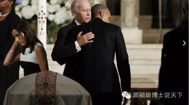 奥巴马致悼词后与拜登拥抱(旁边为博·拜登灵柩)